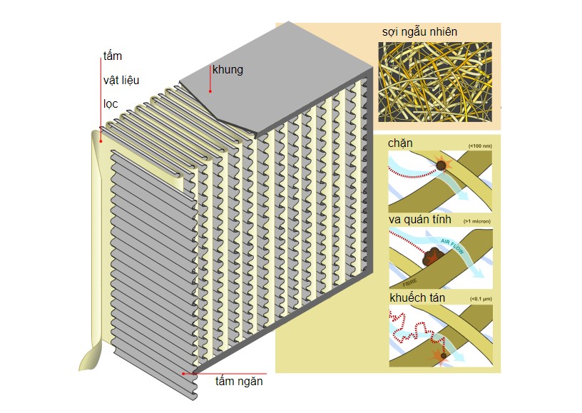Bộ lọc HEPA (High Efficiency Particulate Air) được cấu tạo từ các sợi thủy tinh siêu mảnh, có đường kính chỉ từ 0,2 – 2 micromet, đan xen với mật độ cao. Khi không khí đi qua, các hạt bụi, phấn hoa, vi khuẩn và bào tử nấm mốc sẽ bị giữ lại nhờ lực tĩnh điện và cấu trúc sợi đặc biệt.