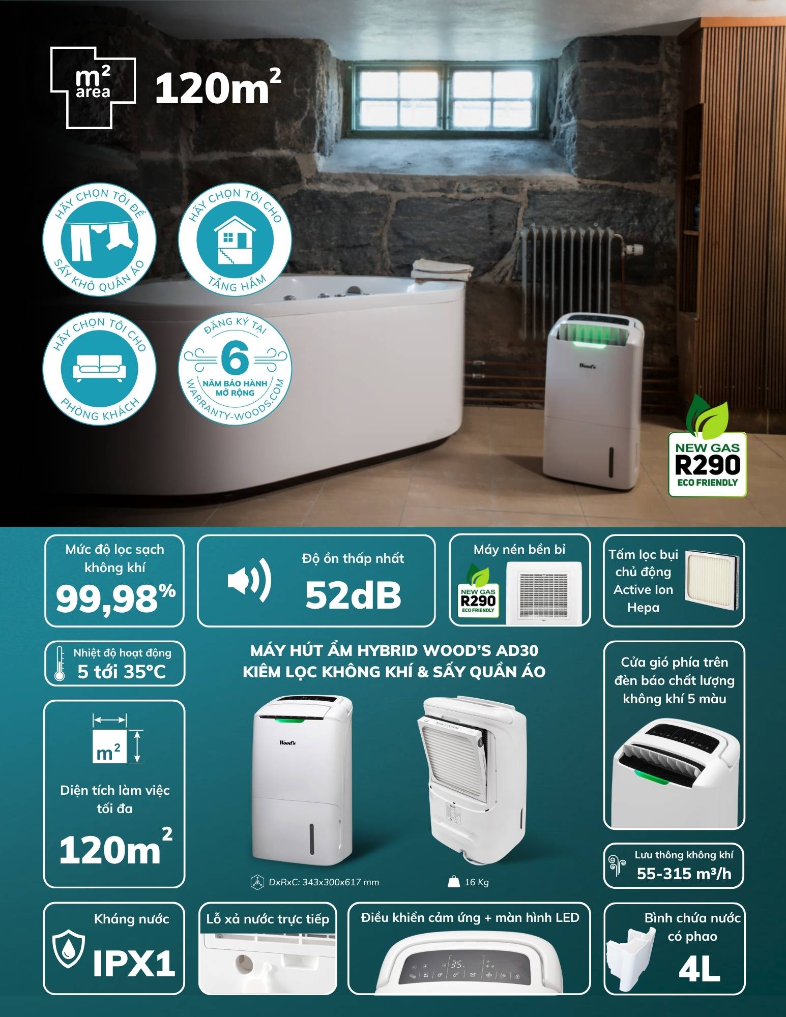 Không chỉ hiệu quả, Wood’s AD30 còn tiết kiệm năng lượng đáng kể nhờ khả năng tự động vận hành khi cần thiết. Máy sử dụng chất làm lạnh R290 – một loại gas sinh học với chỉ số GWP cực thấp, an toàn cho sức khỏe và không gây hại tầng ozone. Công suất tiêu thụ chỉ khoảng 230W, phù hợp cho cả sử dụng cá nhân và gia đình.