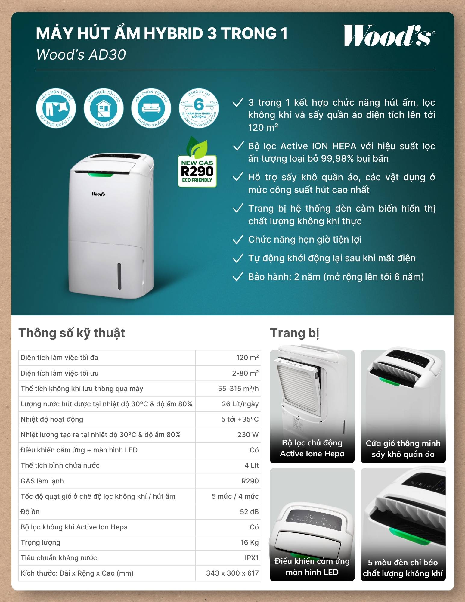 Máy hút ẩm kèm lọc không khí Wood’s AD30