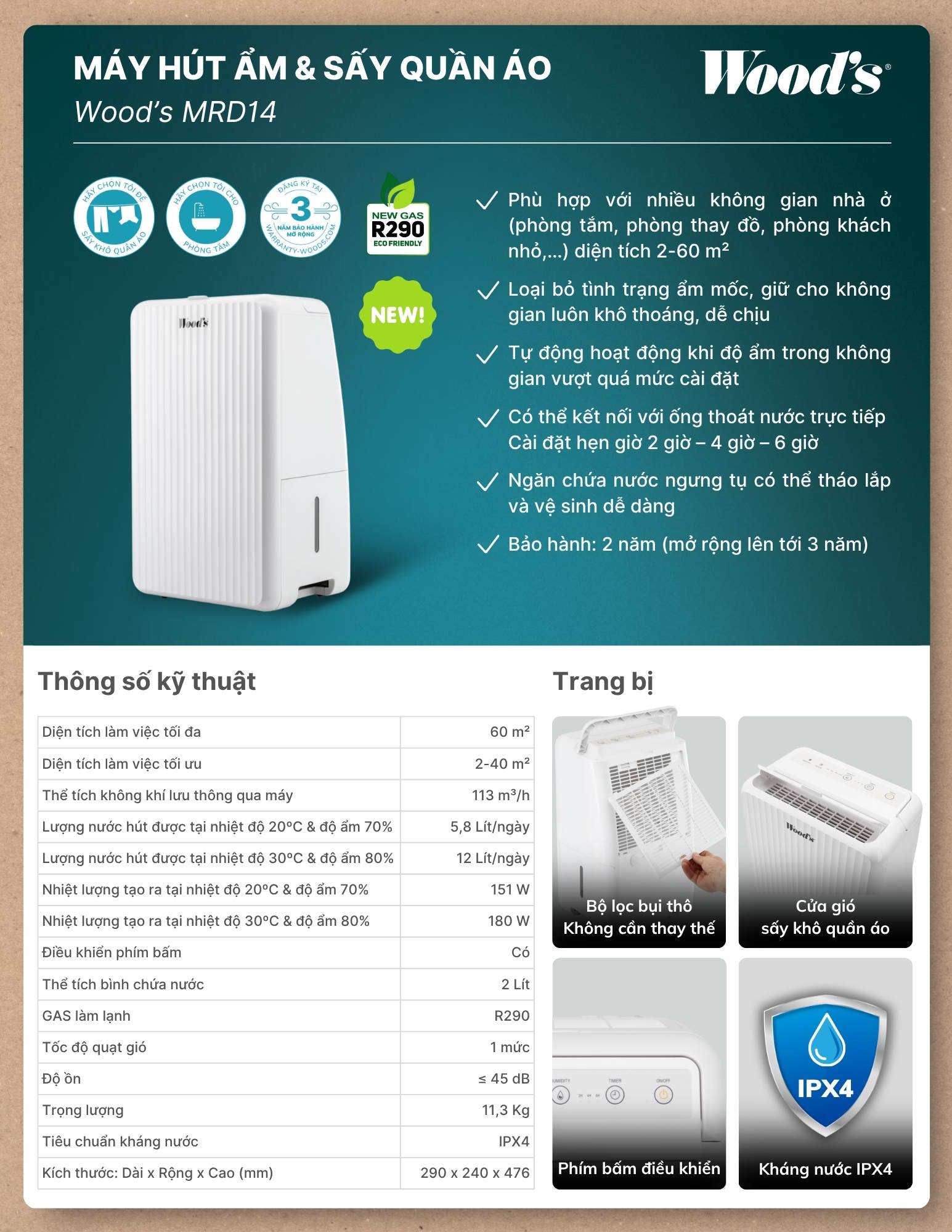 Máy hút ẩm và sấy quần áo Wood’s MRD14