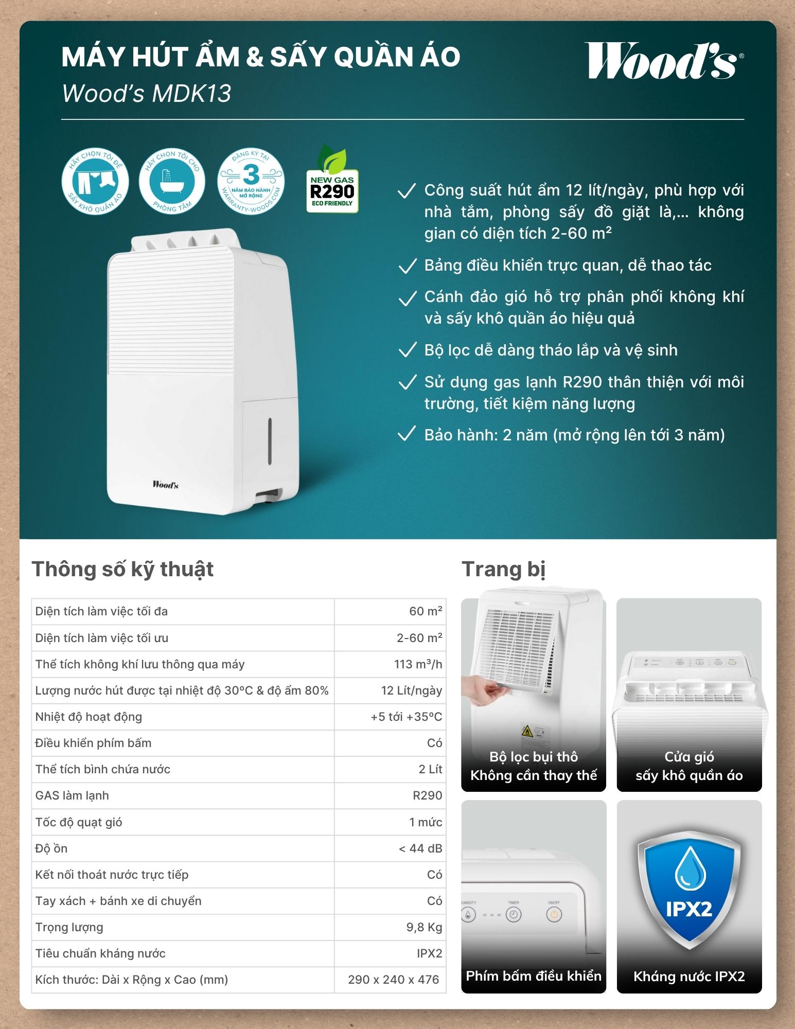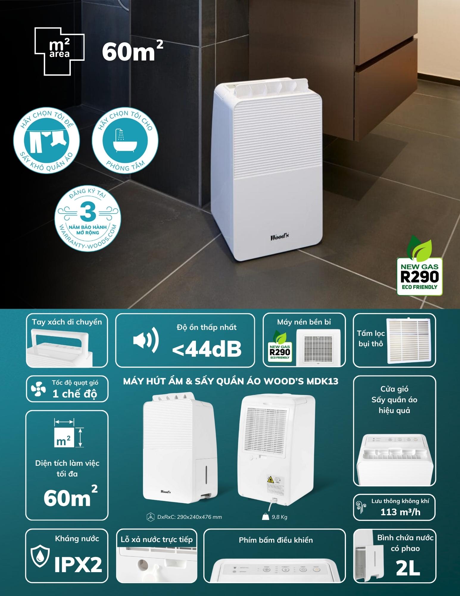 Máy hút ẩm và sấy quần áo Wood’s MDK13